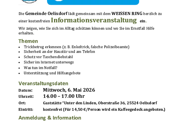Im Rahmen des Störlaufes am 09.05.2026 kommt es in der Zeit von ca. 12.00 Uhr bis 20.00 Uhr entlang der Laufstrecke  in der Stadt Itzehoe sowie den Gemeinden Breitenburg, Kollmoor, Münsterdorf und Oelixdorf zu diversen Vollsperrungen; Umleitungen sind entsprechend ausgeschildert.Aufgrund der aktuellen Sperrung der L 116 Lägerdorf wird die L 115 aus Richtung der Moordörfer in der Zeit von ca. 14.30 Uhr bis 19.00 Uhr zur Sackgasse.
