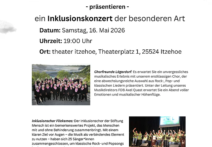 Am Samstag, den 16. Mai 2026 um 19.00 Uhr, präsentieren die Chorfreunde Lägerdorf und der Inklusionschor Fliekemas der Stiftung Mensch aus Meldorf im Theater Itzehoe ein Konzert der besonderen Art.